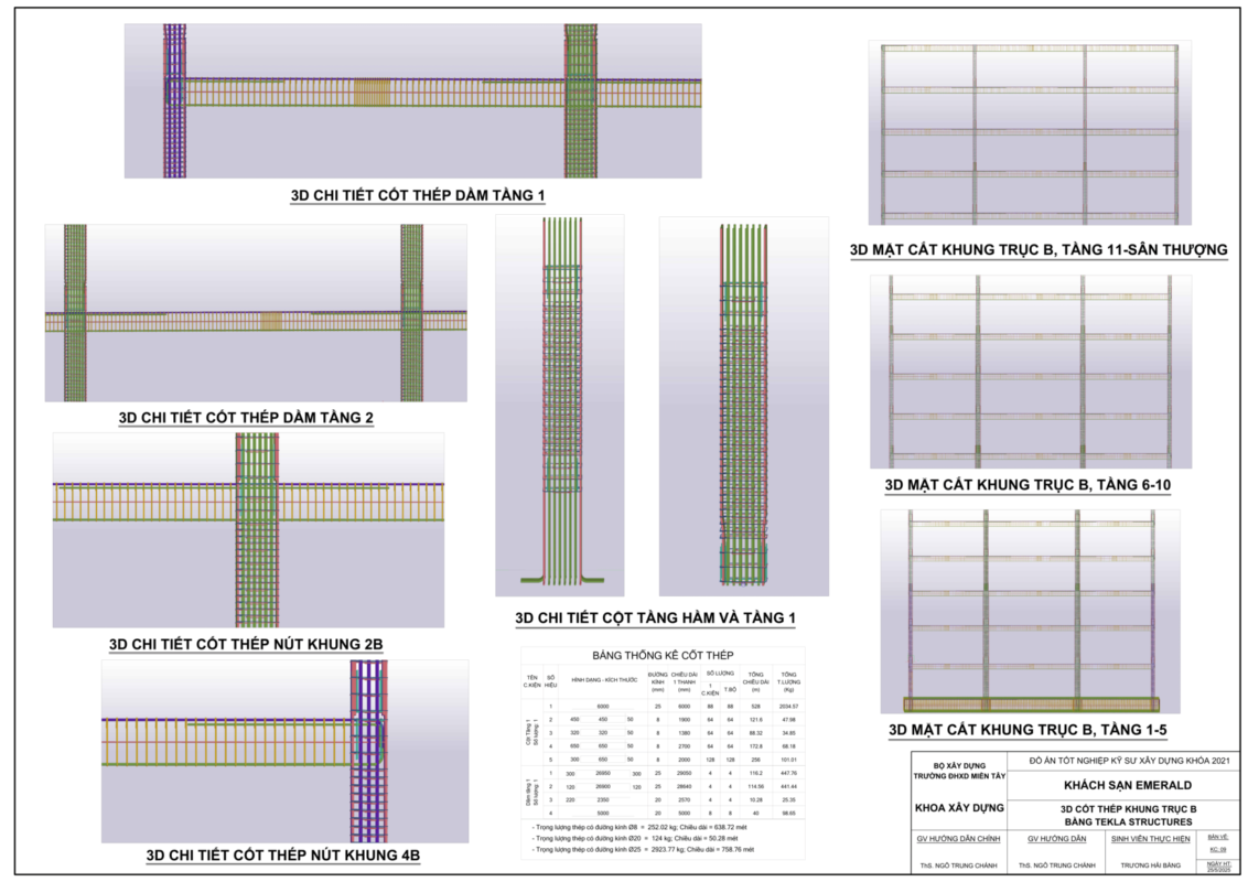 Với sự hỗ trợ của Tekla Structures, Cương đã mô hình hóa chi tiết toàn bộ kết cấu bê tông, cốt thép và ván khuôn, đảm bảo độ chính xác tuyệt đối và tính đồng bộ cao giữa các hạng mục. Dữ liệu thiết kế được liên kết với MS Project để lập tiến độ thi công, tối ưu hóa nguồn lực và chi phí – minh chứng cho khả năng ứng dụng BIM chuyên nghiệp ngay trong môi trường học thuật.